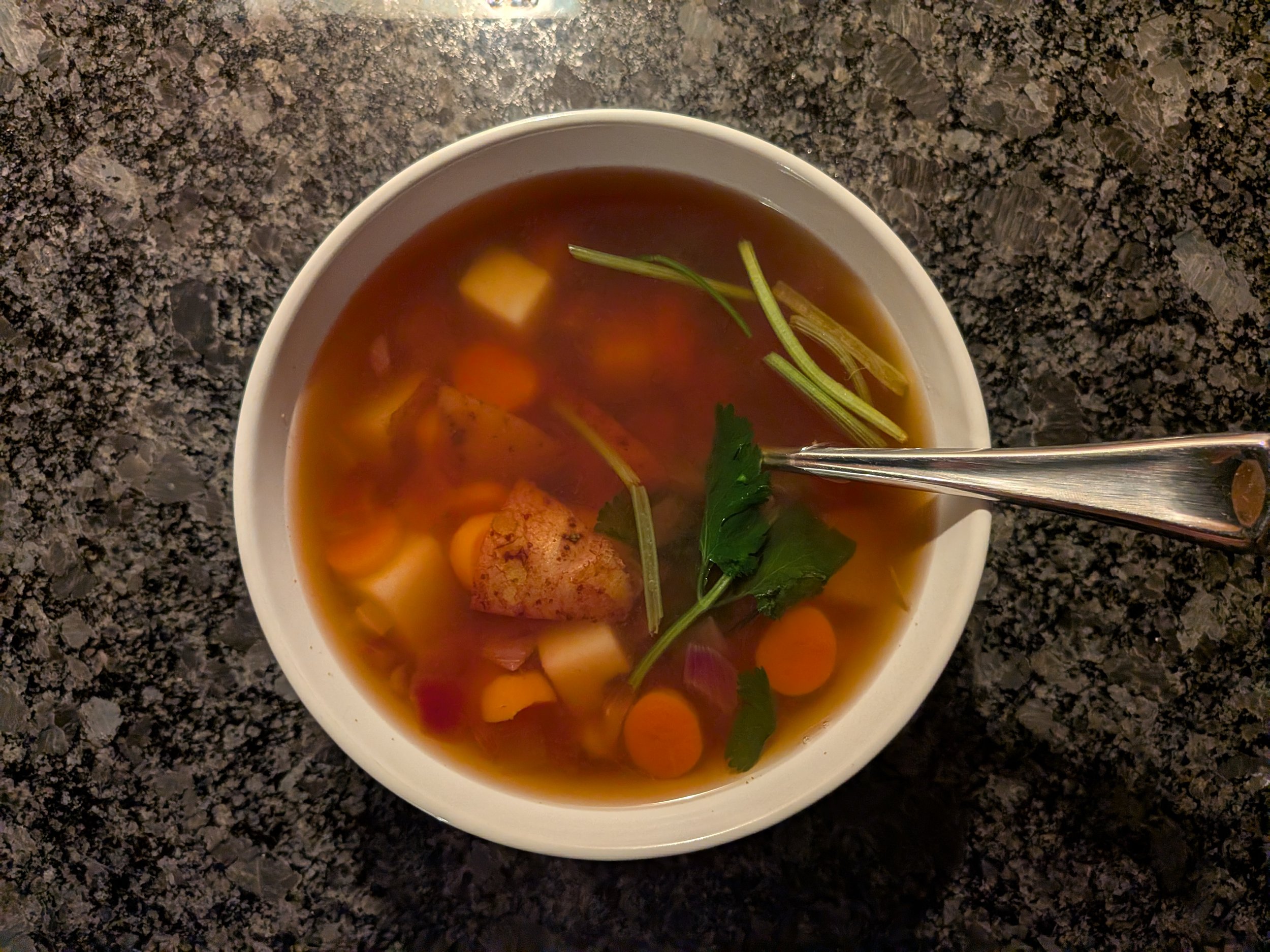 Pour into a bowl, throw some fresh herbs on top, eat w/ a large chunk of bread